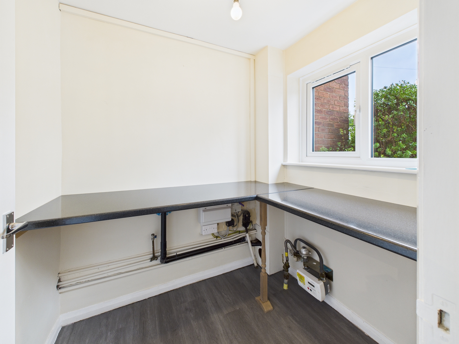 UTILITY ROOM 5' 2" x 6' 1" (1.60m x 1.87m) With wood effect laminate floor, fitted worktops and plumbing for a washing machine. UPVC double glazed window.